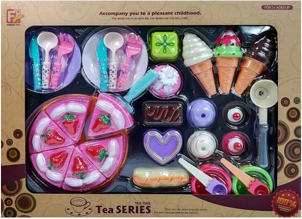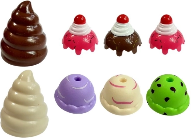 Otroci se lahko zabavajo tudi z drugimi sladkarijami, kot so sladoledi različnih vrst. Komplet vsebuje namizne dodatke in drobne pripomočke v svežih barvah, ki dopolnjujejo igro v popolno pogostitev.