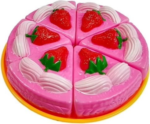 Vključuje realistično videti rožnato torto z jagodami in kremo, ki jo lahko otroci režejo in postrežejo.