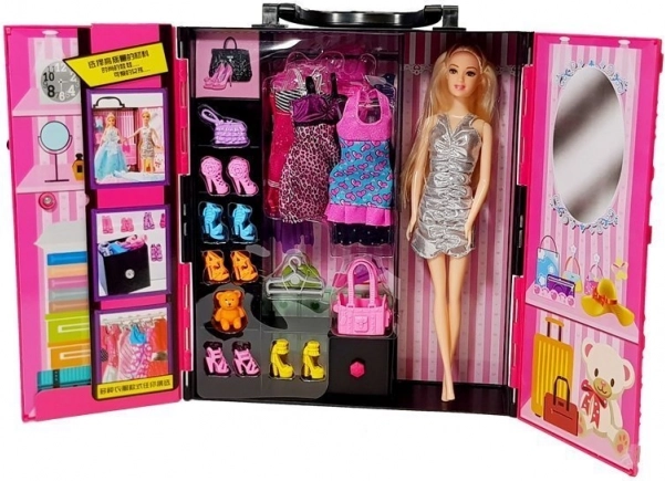 Stilski komplet za male ljubiteljice punčk: rožnata kovčkasta omara z bogato opremo in punčko z dolgimi lasmi. Vsebuje 4 obleke, 7 torbic, 5 parov čevljev, obešalnike in krtačo za lase. Varni materiali, certifikat CE, primerno od 3 let – idealno kot darilo.
