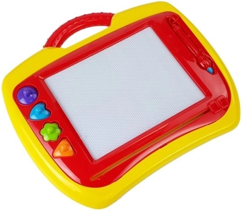 V kompletu so magnetno pero, štirje žigi (krog, srce, zvezda, trikotnik) in praktičen ročaj za enostavno prenašanje. Table so lahke in trpežne, odlične za razvoj fine motorike, ustvarjalnosti in predšolskih veščin.