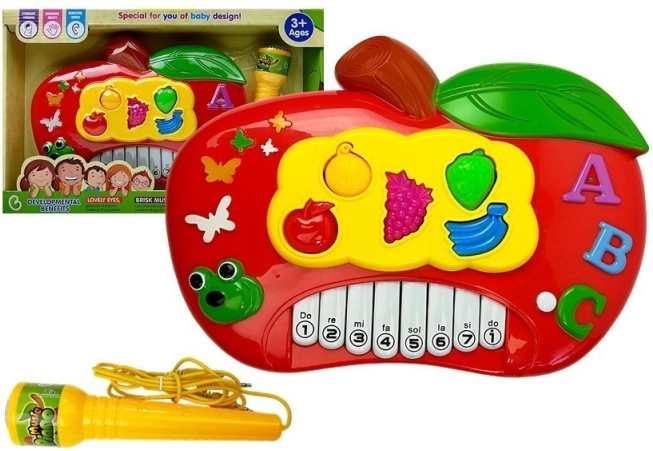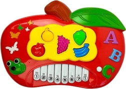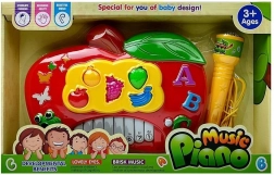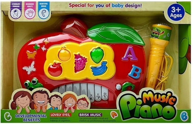 Ljubek otroški klavirček v obliki jabolka z mikrofonom za karaoke bo razveselil male glasbenike. Ponuja 8 tipk, možnost priklopa telefona prek kabla ter izobraževalno igro z oblikami sadja. Zahvaljujoč dvema jezikoma (angleščina, španščina) razvija glasbene in jezikovne spretnosti, z živahnimi barvami pa vabi k igri.