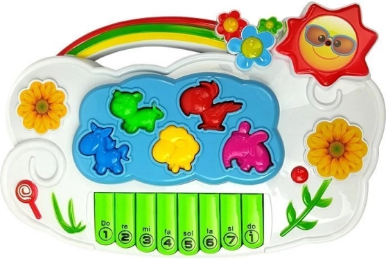 Del klavirja je 8 tipk in pet živalskih elementov (mačka, papagaj, konj, ovčka, slon), ki se vstavljajo na pravilne položaje – odlična oblika zabave in urjenja fine motorike. Igrača ponuja izbiro 2 jezikov (angleščina, španščina) za igrivo učenje besedišča in zvokov.