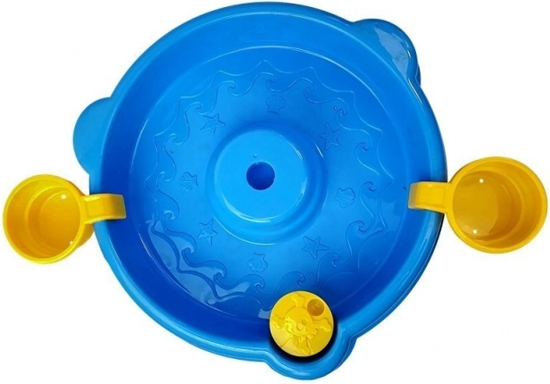 Krožni bazenček z reliefi morskega sveta in držali za lončke ustvari idealno okolje za lovljenje ribic in senzorično igro z vodo.
