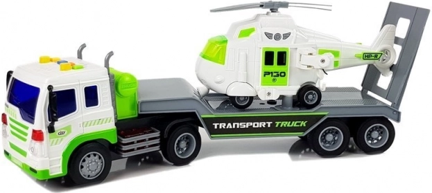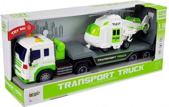 Ta podrobno izdelan prevozni kamion v belo‑zeleni barvni kombinaciji ima dolgo ploščad za udoben naklad helikopterja ali drugih vozil. Zadnja preklopna rampa olajša vstop in varno pritrditev tovora. Za zabavo poskrbijo svetlobni in zvočni učinki – na strehi kabine so 4 gumbi za zagon motorja, hupo, zvok vožnje in vzvratne vožnje. Zahvaljujoč frikcijskemu pogonu je dovolj, da avto potegnete nazaj in spustite.