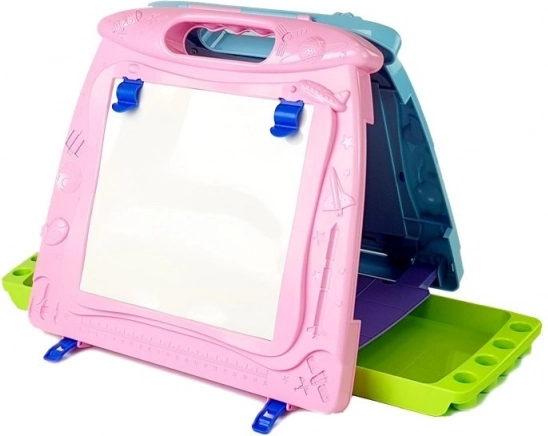 Ta vsestranska otroška tabla ponuja dve površini za neskončno risanje in pisanje: ena stran je primerna za izbrisne flomastre, druga za magnetno risanje s pisalom. Otroci se lahko k risbam kadar koli vrnejo ali jih z enim samim gibom hitro zbrišejo z drsnikom. Lahka zasnova s praktičnim ročajem in dvema stranskima predalčkoma poskrbi, da so vse potrebščine pri roki.
