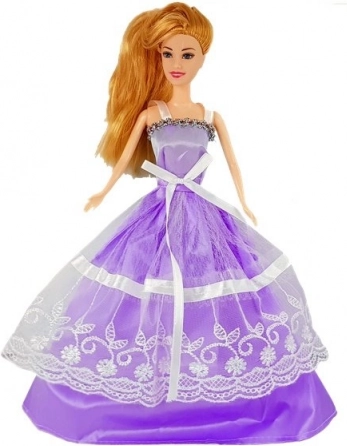 Dolga vijolična obleka z belo čipko daje punčki eleganten videz in vabi k pravljičnim zgodbam.