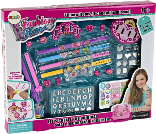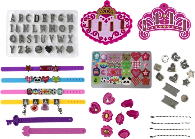 - Črke A–Ž, nalepke z napisi in vzorci, veliki obeski, 4 trakovi za zapestnice (zapiranje na gumbek), verižice za obeske, različne oblike za lepljenje