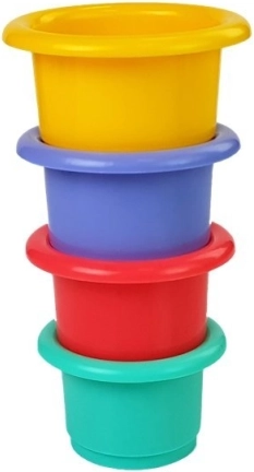 Set vsebuje štiri različna barvna vedra z odprtinami za opazovanje pretoka vode.
