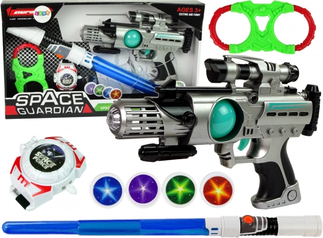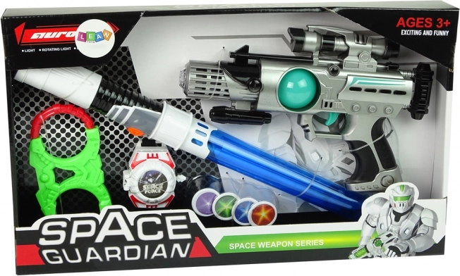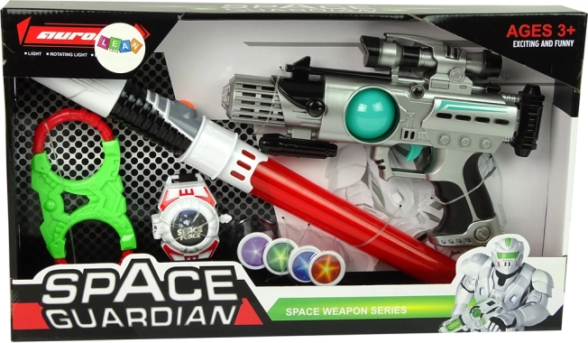 Set vesoljskih orožij Space Guardian je celovit paket za vse majhne pustolovce. Opremljen je ne samo z lasersko pištolo, ampak tudi s svetlobnim mečem, igračami in izstreljevalnikom diskov za kompleksno igralno izkušnjo. Zahvaljujoč svetlobnim in zvočnim efektom je igra s tem setom bolj privlačna in kreativna.