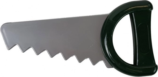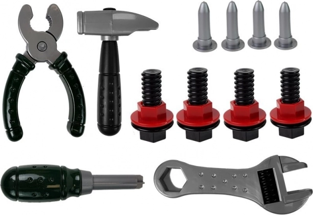 Žaga, kladivo, klešče, izvijač, ključ, vijaki, matice in ploščice za vijačenje – vse iz trpežne plastike brez ostrih robov.
