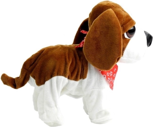 Prisrčen rjavo-beli plišasti kužek na povodcu zna lajati, plesati in peti, premika rep in otrokom prinaša veliko zabave ter učenja odgovornosti. Izdelan je iz mehkih, nestrupenih materialov, varen od 3. leta dalje, s certifikatom CE.