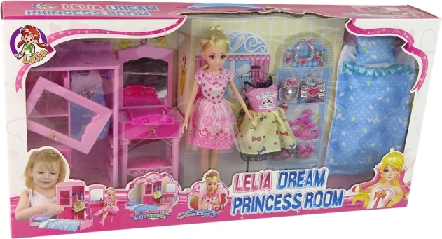 Čarobni set za male stilistke prinaša punčko in celotno spalnico – posteljo z odejico, garderobno omaro in toaletno mizico s stolčkom. Vse v nežno rožnatem dizajnu z modro odejo z zvezdicami spodbuja kreativno in domiselno igro ter uči samostojnosti pri oblačenju in negi punčke.