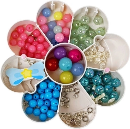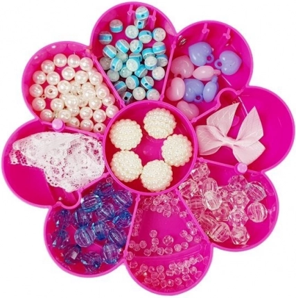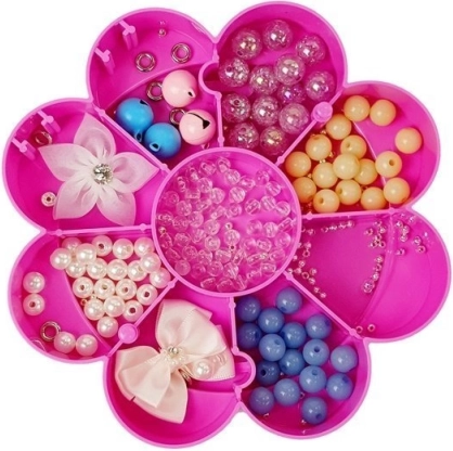 Odkrijte ustvarjalni svet izdelave nakita s tem popolnim kompletom za otroke. Rožnato-beli kovček v obliki cveta s tremi nadstropji in vgrajenim ogledalcem ohranja vse pregledno na enem mestu in navdihuje k ustvarjanju. V paketu najdete približno 20 vrst kroglic v različnih velikostih in barvah, praktičen kovček za nakit ter navodila v angleščini. Odlično za razvoj fine motorike, kreativnosti in osebnega sloga. Primerno za otroke od 3 let.
