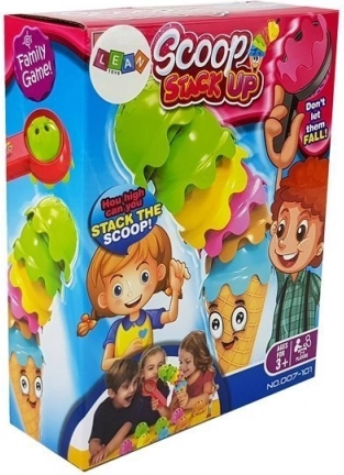 Scoop Stack Up je popolna igra za družinske večere, kjer vi in vaši bližnji preizkusite svoje spretnosti in potrpežljivost pri gradnji stolpa iz sladolednih kepic. Igro lahko igrajo od 2 do 4 osebe, primerna je za otroke od starosti 3 let. Cilj igre je s pomočjo žličke postaviti čim več kepic na kornet, ne da bi celotni stolp padel.