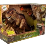 Interaktivni dinozaver bo razveselil vse ljubitelje prazgodovine in akcijskih zgodb. Po vklopu se sam premika naprej, slišijo se koraki in strašljiv rjov, oči pa zasvetijo rdeče. S pritiskom na sprožilec na pištoli začnete dvoboj – vsak zadetek sproži svetlobne in zvočne učinke; pri devetem zadetku se T‑rex zruši in predvaja učinek poraza.