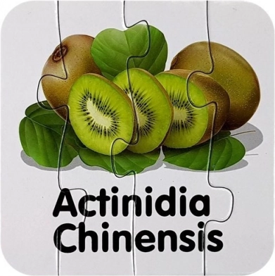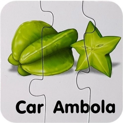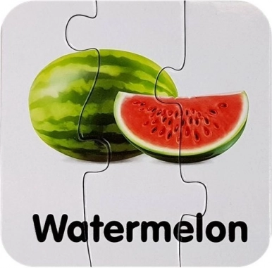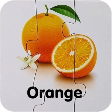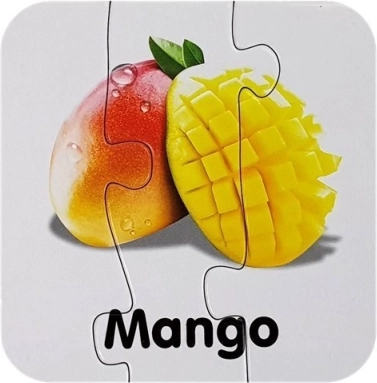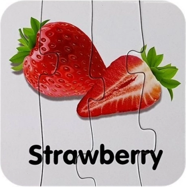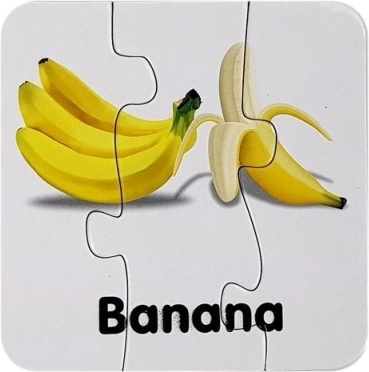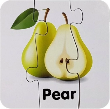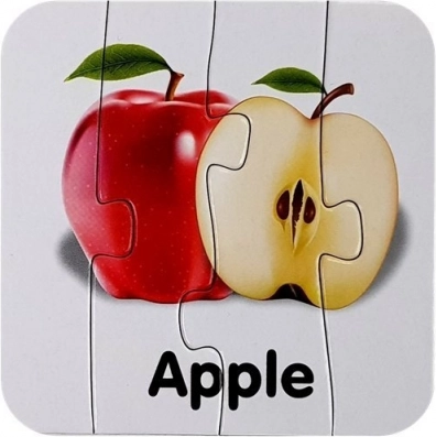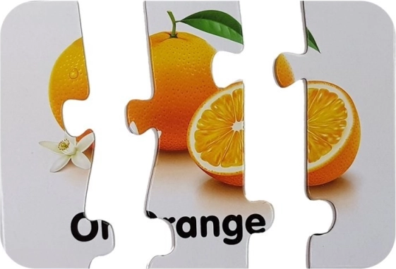 Vsak košček prikazuje sadje in njegov naziv v angleščini (npr. Apple, Banana, Orange). Otroci si besede lažje zapomnijo zaradi povezave med sliko in besedilom.