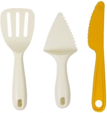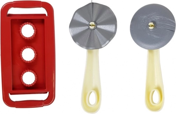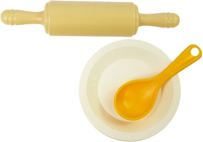 Set vsebuje valjar, žlico, lopatko, nož za serviranje in skodelico – vse za realistično igro v otroški kuhinji.