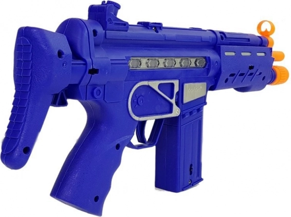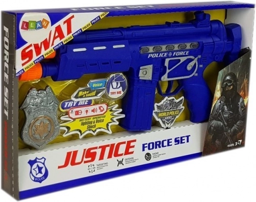Komplet za malega stražnika je sestavljen iz dveh kosov. Vsi so izdelani iz visokokakovostne plastike, kar zagotavlja, da bodo vašemu otroku dolgo služili. Igrača je v mornarsko modri barvi. Puška oddaja hiter zvok streljanja, le pritisniti je treba na sprožilec. Nobenemu tatu ne bo uspelo pobegniti! Otroška domišljija se bo zagotovo razširila. Dodatna prednost sta svetlobni učinek med streljanjem in vibracijski način, ki se aktivira ob pritisku na sprožilec.
