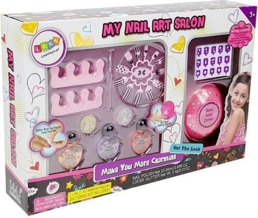 Ta manikirni set je odličen način, kako zaposliti deklice in jim omogočiti eksperimentiranje z otrokom prijazno kozmetiko. Pripomočki, kot so sušilnik za nohte, laki v čudovitih barvah, nalepke ter seveda bleščice in druge dekoracije, pomagajo ustvariti edinstven slog.