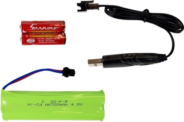 Priložen je akumulator 4,8 V 700 mAh in USB kabel za udobno polnjenje. Do 15 minut vožnje po približno 200 minutah polnjenja.