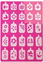 Komplet vključuje vse potrebne pripomočke, kot so brezbarvni lak, pilica v obliki srca, bleščice v roza in srebrni barvi ter samolepilni šabloni.