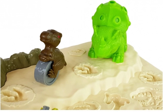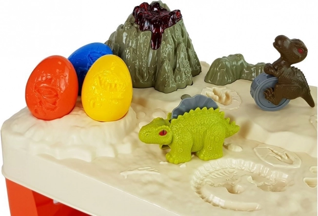 Miza ponuja vulkan s svetlečo lavo za dodatno raven igre. V kompletu so tri jajčka, ki skrivajo malega dinozavra, ter tri večja prazgodovinska bitja za precizno izrezovanje in odtiskovanje motivov. Tako se razvijata fina motorika in vizualna koordinacija otrok.