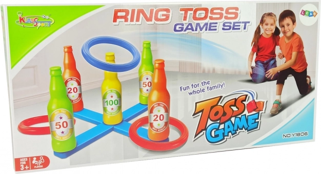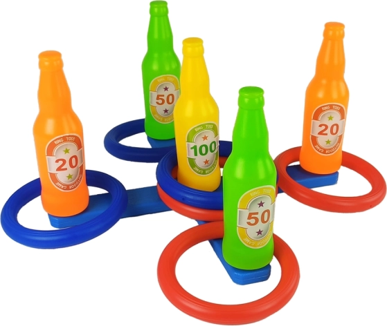 Zabavna družinska igra metanje obročev s petimi barvnimi stekleničkami in točkovanjem razvija natančnost, koordinacijo oko–roka ter motivira otroke k aktivnemu gibanju na prostem in doma. Enostavna sestava, 6 obročev v dveh barvah in veliko tekmovalnih različic za male in velike.
