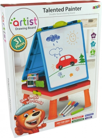 Tabla ima dve površini – belo za izbrisljive flomastre in črno za risanje s kredo. Priložen je komplet flomastrov v petih barvah in 12 kosov krede. Poleg tega prejmete kocko in figurice za družabne igre, kot so Človek, ne jezi se in Kače in lestve.