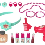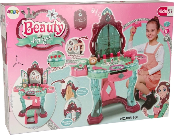 Vključuje raznolike kozmetične dodatke: dele za sestavo mizice, nalepke, sušilnik za lase, glavnik, lake za nohte, prstančke, zapestnice, ogrlico, lasne sponke, dišavo, šminke in stolček. Mizica je v pastelnih barvah, ki se zlahka podajo v vsako otroško sobo.