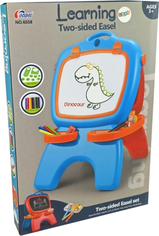 Dvostranska magnetna in kredna tabla za male umetnike in šolarje ponuja belo površino za suho brisanje ter črno površino za risanje s kredo. V pakiranju najdete 12 flomastrov, 12 kred, šablone črk in oblik, praktične predalčke za dodatke ter kaveljček za pritrditev papirja. Spodbuja kreativnost, fino motoriko in koordinacijo oko–roka.