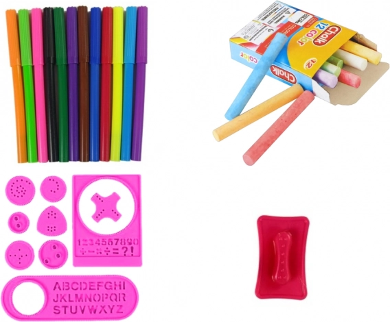 - V paketu prejmete: tablo, 12 barvnih flomastrov, 12 barvnih kred, šablono z geometrijskimi oblikami, šablono s črkami, svetleči flomaster za razkritje skrivnih risb.