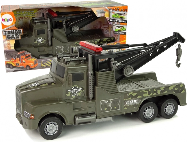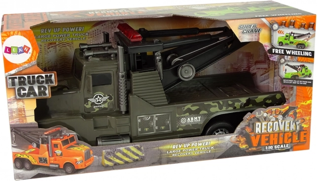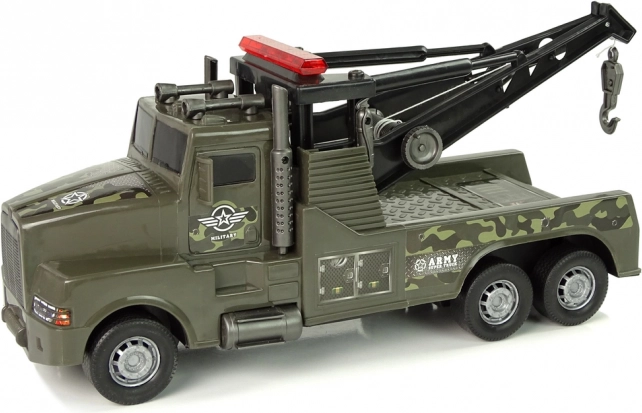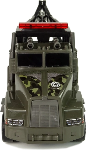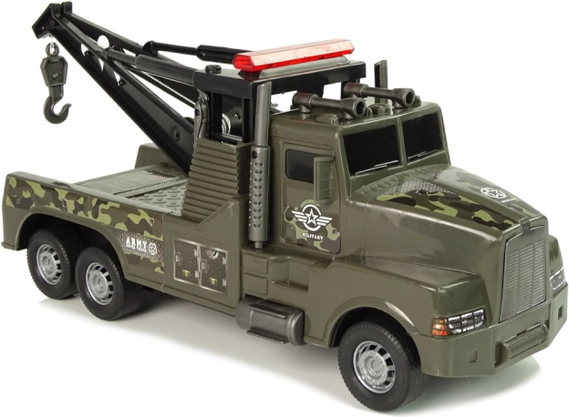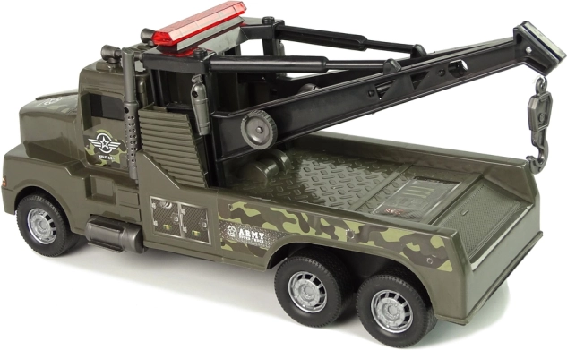 To plastično vlečno vozilo s kamuflažnim potiskom in vojaškimi nalepkami bo navdušilo vse otroke, ki imajo radi akcijske in reševalne misije. V zadnjem delu je nameščen žerjav z vitlom, ki se izvleče s pomočjo stranske ročice, na koncu pa ima trden kavelj za preprosto pripenjanje drugih igrač.