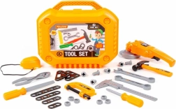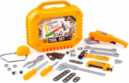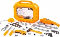 Otroški komplet orodja je zasnovan za male mojstre, ki želijo posnemati mamo ali očeta pri delu v delavnici ali na vrtu. Vsi elementi so iz trpežne plastike, varni za igro in se preprosto shranjujejo v čvrst kovček. Brusilnik ob pritisku na gumb zavrti kolut, zaščitna maska ima elastični trak, zato ustreza vsakomur.