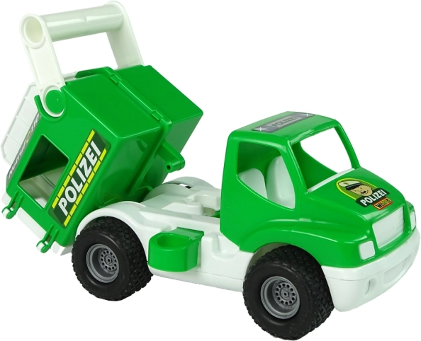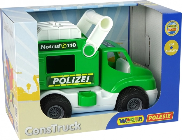 Zeleni policijski avto ConsTruck znamke Polesie je vzdržljiva igrača za otroke od 1. leta. Ponuja gumijasta kolesa z dezenom za boljši oprijem, odpirajoča se zadnja vrata in zgornji predal za shranjevanje zakladov in figuric. Stranska varovalka prikolice in nagibna kesica zagotavljata dolge ure zabave ter spodbujata razvoj fine motorike in logičnega mišljenja. Izdelano iz varnih, atestiranih materialov, z certifikatom CE.
