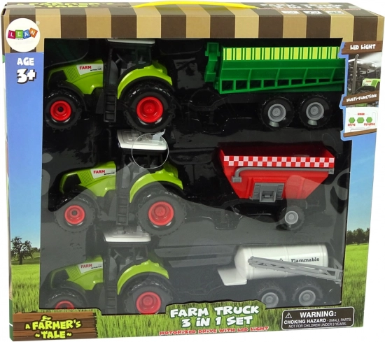 Komplet za male kmete prinaša tri podrobno izdelane traktorje in tri različne prikolice: cisterno za vodo, keson za žito in voz za krmo. Otroci se na zabaven način seznanijo s tem, kako delujejo kmetijski stroji in katera dela se opravljajo na kmetiji.
