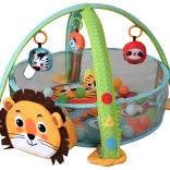 Pri igri na trebuščku ali na hrbtu otrok vadi fino in grobo motoriko ter koordinacijo roka–oko pri lovljenju visečih igrač. Lev dodatno služi kot praktičen shranjevalni prostor za žogice. Set je primeren od rojstva, izpolnjuje CE in standard EN 71 ter je zaradi darilne embalaže odlična izbira za novopečene starše.