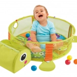 Ta vsestranska igralna podloga v obliki želve je idealna za prve mesece otrokovega življenja. Prijeten, mehak material in intenzivne barve spodbujajo čute, medtem ko ograjica z mrežastimi stranicami ustvarja varen prostor za igro. Želvin trup lahko služi kot praktičen prostor za shranjevanje žogic.