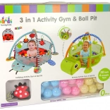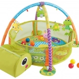 Mehka izobraževalna podloga v obliki želve z ograjico in 30 žogicami ponuja varno in pestro okolje za igro in razvoj dojenčka. Zaradi različnih možnosti postavitve podpira motoriko, koordinacijo oko–roka ter učenje barv in oblik. Enostavna za čiščenje in privlačna z živimi barvami ter visečimi igračami.