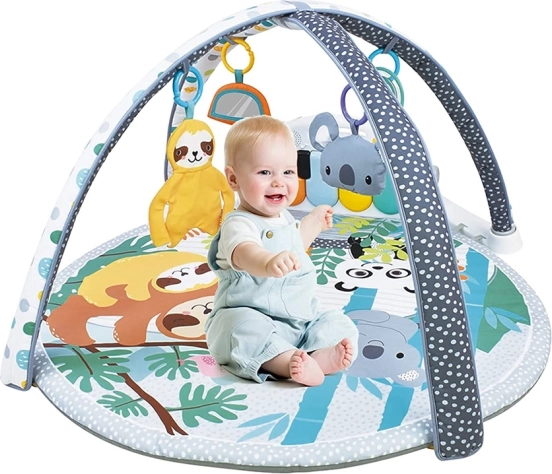 Udobna podloga z veselimi živalicami nudi varen prostor za igro na trebušku in na hrbtu.