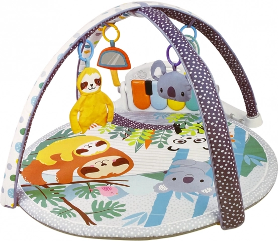 Ta mehka in varna izobraževalna podloga z motivom džungle nudi dojenčku navdihujoč prostor za vsakodnevno odkrivanje. Barvite viseče igrače (koala, lenivec, ropotuljice) in odbojna plošča, ki deluje kot ogledalce, naravno spodbujajo otroka k stezanju, prijemanju in obračanju. Del kompleta je snemljiv klavirček z osvetljenimi tipkami, ki ob pritisku predvajajo tone in melodije – idealno za razvoj sluha in ritmičnega čuta.