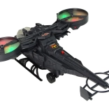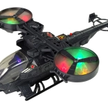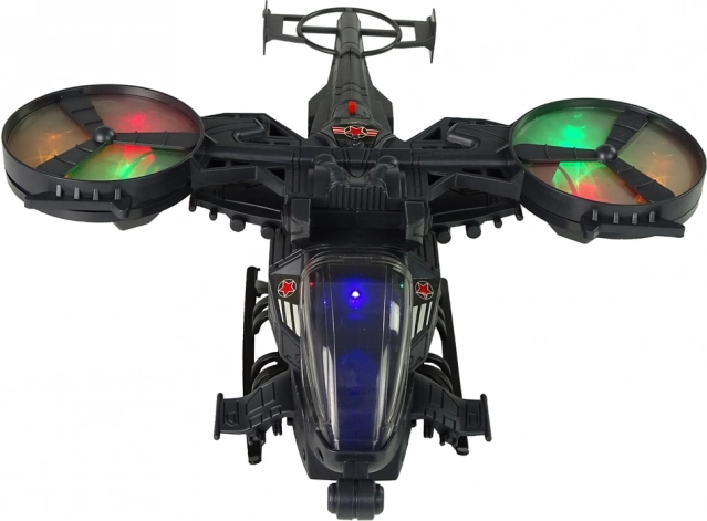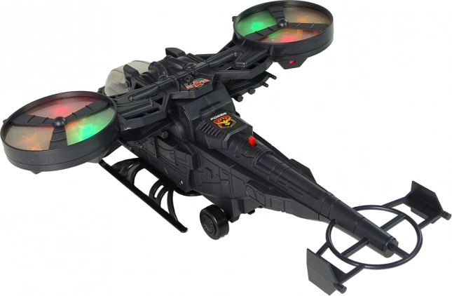 Helikopter ima velike vrtljive rotorje, ki svetijo v različnih barvah in jih dopolnjujejo zvočni učinki, ki posnemajo zagon in streljanje. Zaradi koles na spodnjem delu se helikopter lahko premika po tleh.