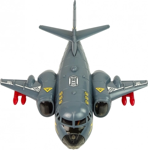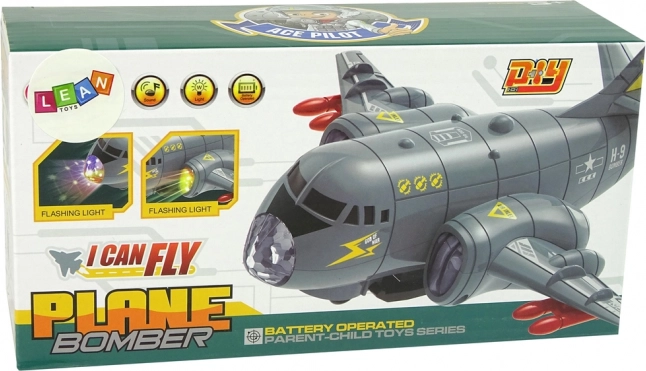 Ta interaktivni bombnik je idealen za ljubitelje vojske in letalstva. Siva zasnova z rdečimi raketami daje avtentičen vojaški videz. Igrača je narejena iz trpežne plastike in vsebuje barvne LED diode, ki svetijo na trupu in krilih, skupaj z realističnimi zvočnimi učinki, kot sta vzletanje in streljanje.