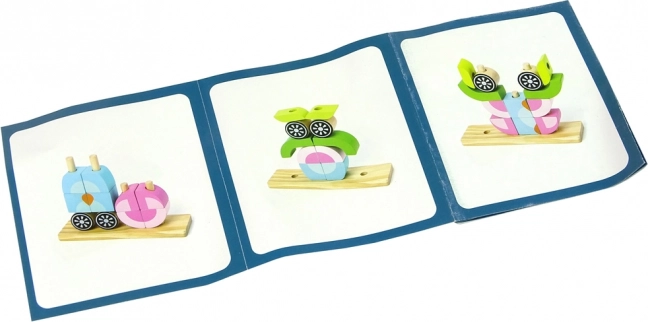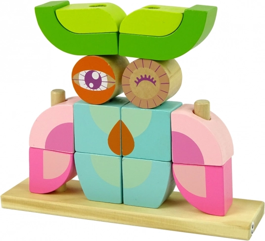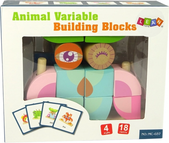 Set vključuje leseno osnovo in 12 kock, ki jih je mogoče sestaviti v različne oblike, kot so živali ali predmeti. Otrok lahko naniza kocke na palčke osnove v različnih konfiguracijah, kar razvija ustvarjalnost.