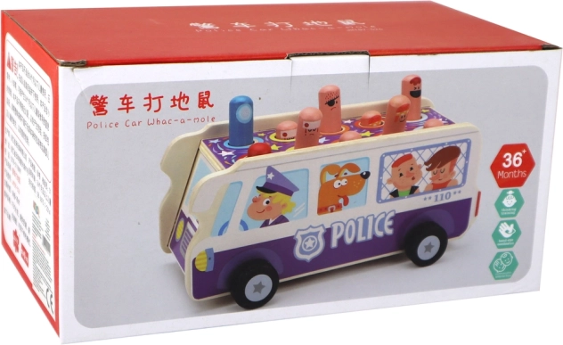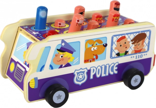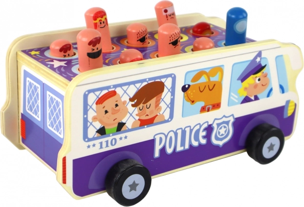 Zabavna lesena spretnostna igra v obliki policijskega avtobusa razvija fino motoriko, koordinacijo oko–roka in hitre reakcije. Otroci s kladivcem “tolčejo” izskočne figurice, zahvaljujoč kolesom pa se lahko z avtobusom tudi vozijo. Kakovostna lesena izvedba, varni materiali, certifikat CE in skladnost z EN71 za brezskrbno otroško igro.