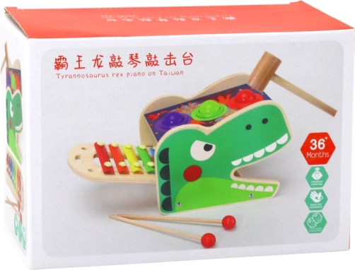 Zabavna in izobraževalna igrača 2v1 v obliki dinozavra združuje zabijanje barvnih kroglic in igranje na ksilofon. Spodbuja fino motoriko, koordinacijo oko–roka, ritem in glasbeni čut. Trdna lesena izvedba zagotavlja varnost in dolgo življenjsko dobo, idealno za otroke od 3 let naprej.