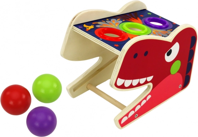 Barvite kroglice se zabijajo v odprtine v telesu dinozavra, kar na zabaven način uri natančnost, moč prijema in koordinacijo oko–roka.