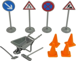 Stožci, znaki, samokolnica, lopata in drugo orodje ustvarijo realistično gradbišče. Otroci se na zabaven način učijo prometnih znakov in pravil.