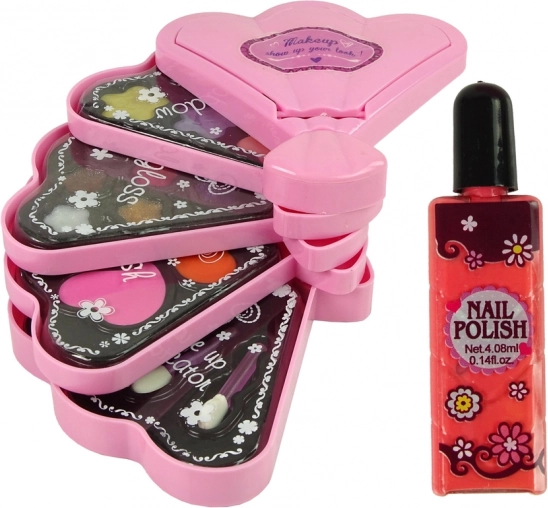 Roza kozmetični komplet v obliki školjke vsebuje štiri predelke z različnimi kozmetičnimi izdelki za ličenje oči, lic in ustnic.