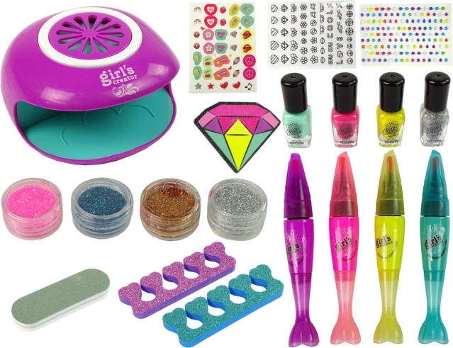 .Po izenačitvi dolžine in oblike nohtov z diamantno pilico nanesite na nohte izbrano barvo. Naslednji korak je, da roko vstavite v posebno lučko za nohte. Po vstavitvi roke se prižge luč, kot pri pravem pripomočku. Peresa omogočajo natančno risanje vzorcev in so na voljo v dveh barvah. Z risanjem vzorcev deklica razvija natančnost in ustvarja svoj slog. Nalepke, diamanti in bleščice dodajo izvirnost in lesk.
