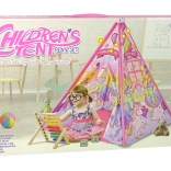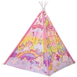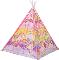 Šotor je enostavno zložiti in otrokom nudi prostor za zabavo ali počitek po napornem dnevu. Njegova streha je okrašena z motivi veselih enorogov in barvitih gradov, ki spodbujajo otroško domišljijo.